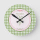 A cute country style green gingham monogram clock with a pink gingham label and a girly filigree pink ribbon. Personalize by adding your name and initials. Will appeal to the stylish and feminine girl.