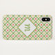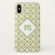 A girly quatrefoil pattern Barely There iPhone x Case in greenery green and white and decorated with cute yellow and orange retro daisy flowers. Personalise for the special girl in your life by adding her monogrammed initial to the diamond-shaped badge.