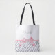 A trendy grey tiger stripes pattern tote bag embellished with a picture of a girly pink satin bow. Personalise by adding the name of your favourite girl. Flat printed image, NOT affixed with an actual ribbon.