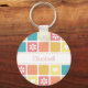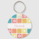 A girly square tile pattern keychain with modern style rounded corners in pretty spring colors, decorated with cute hearts and retro daisy flowers. Personalize by adding the name of any girlie girl to this retro mod design in shades of coral pink goldenrod yellow, and turquoise blue.