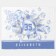 This girly volleyball themed fleece blanket features an "explosion" of varied size light blue and white volleyballs and blue, grey and white star shapes on a customisable black background - customise with athlete's name and jersey number - the blue and grey volleyball panels are blended with a girly floral kaleidoscopic pattern for a textured appearance, and a tiny white polka dots pattern overlies the blue star - by katz_d_zynes
