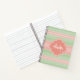 A girly pastel green lacy knit pattern standard size notebook with coral pink stripes that you can personalise by adding your name and monogrammed initial to the quatrefoil shaped badge. This is part of the Nile Green and Blooming Dahlia Knit Collection. Flat printed image NOT made with yarn or lace.