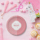 Girly light pink paper plates with a houndstooth pattern in vertical stripes. Personalise this contemporary design in a trendy shade of pink by adding the name and monogram initials of the fashionable young woman.