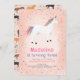 This cute girls’ 3rd birthday invitation features a pastel pink background with a unicorn, rainbow confetti, and stars, plus a matching horse and unicorn magical pattern on the back. Easily edit the front with your child’s details and age — perfect for any unicorn or horse-themed birthday party.