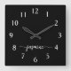 Girly Simple Minimalist Black Monogram Name Script Custom Personalised Square Wall Clock. These design featuring your first name in a pretty hand lettered style swash tail font signature typography white script on black colour background. These are easy to customise it. Great stylish feminine housewarming gift, also for birthday, wedding, bridal shower, mother’s day, sweet 16 birthday party and baby shower, graduation and It’s for the girl who loves unique sparkle stylish things.