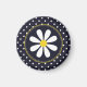 A round magnet with a girly retro daisy flower on the top with white daisies with a yellow centres against a navy blue background, and a trendy blue and white polka dot pattern on the outside.