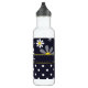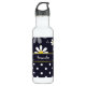 A bottle with a girly retro mod flower pattern on the top with white daisies with yellow centres against a navy blue background, and a trendy blue and white polka dot pattern on the bottom. Personalise by adding your name. Perfect for a stylish girly girl.