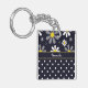 A keychain with a girly retro mod flower pattern on the top with white daisies with yellow centres against a navy blue background, and a trendy blue and white polka dot pattern on the bottom. Personalise by adding your name. Perfect present for a stylish girly girl.