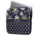 A Laptop Sleeve 10 inch with a girly retro mod flower pattern on the top with white daisies with yellow centres against a navy blue background, and a trendy blue and white polka dot pattern on the bottom. Personalise by adding your name. Perfect present for a stylish girly girl.