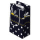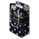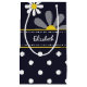 A gift bag with a girly retro mod flower pattern on the top with white daisies with yellow centres against a navy blue background, and a trendy blue and white polka dot pattern on the bottom. Personalise by adding the name of your recipient. Perfect present for a stylish girly girl.