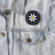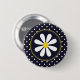 A circle button with a girly retro daisy flower with a yellow centre against a navy blue background, and a trendy blue and white polka dot pattern on the outside.
