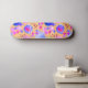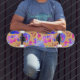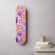 Colorful purple, orange, and pink abstract modern art skateboard with personalized name in casual hand-lettered white typography script.