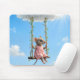 A cute girl mouse in a pink dress swings from a cloud suspended by flower-adorned ropes against a bright blue sky filled with fluffy clouds and a shining sun