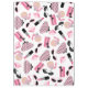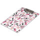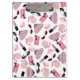 A clipboard featuring a girly themed pattern with illustrations of purses, perfume, lipstick, retro cat eye sunglasses, and pink diamonds.
