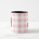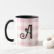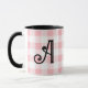 Fun and stylish pink, black, and white custom mug featuring a pink buffalo plaid print topped with initial in decorative scroll. Featured is the letter A in black on a black and white mug with pink check print. The text is fully customisable, including colour, style, size, and location. Other mug styles available. Designed by 369MyName.
