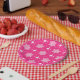 Festive pink and white snowflakes christmas pattern on paper plates.