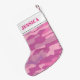 Personalised Christmas stocking with custom name monogram. Girly pink army camouflage design or customixable colour. Cute monogrammed xmas decorations for the Holidays. Change the quantity to get the cheapest price per sock. Vinatage military typography letters for name or initials. Cool x-mas stocking for women and girls. Hunter pink camo design.