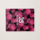 This pink and black girls' basketball jigsaw puzzle features a pattern of varied size hot pink basketballs that appear to fade into the black background - customise with basketball player's name and jersey number - by katz_d_zynes