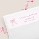 Girly bridal shower return address label featuring light pink bows and elegant fonts in which all your personalised information is written. You can find matching products from this collection in our store.