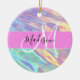 Girly pink, peach and aqua holographic iridescent monogram name and initial ceramic ornament. Your custom name and monogram are written in an elegant hand lettered script with a pink background. A perfect birthday or Christmas gift!