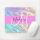 Girly pink, peach and aqua holographic iridescent monogram name and initial mouse pad. Your custom name and monogram are written in an elegant hand lettered script with a pink background. A perfect birthday or Christmas gift!