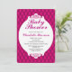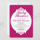 Cute girly pink pin-tucked background design with an upholstery look. It also features a white fancy scrolled badge containing your personalised baby shower details in dark grey and hot pink text. The backside of the invitation has the full pin-tucked design with a purplish pink ribbon with a bow graphic.