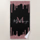 Girly Pink Rose Gold Glitter Sparkle Drips Beach Towel featuring sparkly faux glitter drips and your custom name and monogram on a chic black background. Easy to customise and perfect for your girly aesthetic!