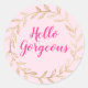 Girly and pretty blush pink gold wreath classic round sticker featuring the words "Hello Gorgeous" in an elegant hot pink script.