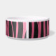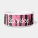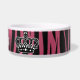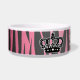 A girly zebra striped pattern in pink and black with a crown. Shown on a dog food dish