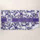 This volleyballs pattern beach towel features a random pattern of varied size purple, grey and white stylised volleyballs turned every which way on a customisable white background - personalise with her name and jersey number - by katz_d_zynes