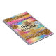 A gorgeous abstract pattern of horizontal rainbow coloured brush strokes covered with faux sparkling and shiny glitter has a golden abstract shape across it on which the inspirational words, hello beautiful appear next to a single hand drawn pink heart framed with a black outline. These are ideal as gifts for adult women and girls. Gift it as a birthday present or as a special spoil just because you can.