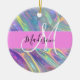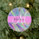 Girly rainbow holographic iridescent monogram name and initial ceramic ornament. Your custom name and monogram are written in an elegant hand lettered script with a pink background. A perfect birthday or Christmas gift!