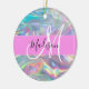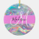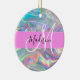 Girly rainbow holographic iridescent monogram name and initial ceramic ornament. Your custom name and monogram are written in an elegant hand lettered script with a pink background. A perfect birthday or Christmas gift!