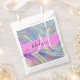 Girly rainbow holographic iridescent monogram name and initial favour bags. Your custom name and monogram are written in an elegant hand lettered script with a pink background. A perfect birthday or Christmas gift!