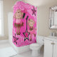 Girly shower curtain in pink and white paisley pattern with two adorable brown monkeys in pink and brown dresses with guitar and microphone. There's also a couple of pink and black stars with musical notes.