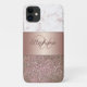 This girly faux glitter phone case will have your phone protected in style. This trendy design features textures of rose gold and white marble, rose gold faux metallic texture and faux rose gold glitter. Atop the rose gold metallic centre is a monogrammed initial in script typography with a name in dark rose gold to personalise. Makes a unique girly gift for any special occasion. Designed by artist ©Susan Coffey.