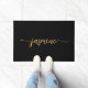 Girly Feminine Minimalist Simple Clean Black and Gold Monogram Name Signature Script Custom Personalised Doormat. This design featuring your first name in a pretty hand lettered style swash tail font signature typography (or calligraphy) in gold on black background. Great stylish feminine housewarming gift, also for birthday, anniversary, wedding, bridal shower, bachelorette party and It’s for the girl wholikes clean minimalist things.