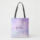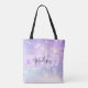 Girly and cute tote bag with a colourful pink, purple, lilac and blue unicorn rainbow hearts sparkly background. Your custom name and monogram are written in an elegant hand lettered script with a lilac purple unicorn paint brush strokes stripe background. A perfect birthday or Christmas gift!
