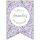 This is a cute & girly "Sweet Little One" birthday bunting banner adorned with adorable hand-drawn candies and purple & white pin-stripes.