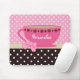 A girly pink and brown polka dot pattern mousepad with a cute pink teacup trimmed with a trendy heart border, and a pretty pink ribbon tied in a bow on the handle. Personalise by adding your name. Perfect present for the girly girl who would love to bring a fun tea party wherever she goes!