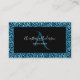 This trendy, professional, bold and unique glam girly design features a large customizable monogram in teal turquoise aqua blue green on the front in elegant display typography along with a customizable name in beautiful script with a hand-lettered look in white inside a teal-edged black rectangle, with the job title below. The background includes glam leopard spots on a bright turquoise background. The back of the card features more customizable text. You can personalize this item by changing the monogram, name and text in the product template.