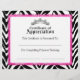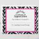 © 2013 Socialite Designs. Our girly certificate of appreciation designs has a silver tiara / crown, zebra stripes pattern background and pink lace scalloped certificate edge. A wonderful certificate for a pageant.