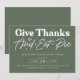 Celebrate the spirit of gratitude with our elegant green Thanksgiving dinner invitation. This beautifully designed card features a rich green backdrop, perfect for setting a warm and inviting tone for your holiday gathering. The invitation elegantly conveys the message to "give thanks and eat pie," making it an ideal choice for inviting family and friends to share in the joy of Thanksgiving feasting.