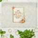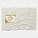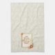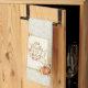 Kitchen towel that reads, “Give Thanks with a Grateful Heart” in a handwritten font, surrounded by a modern pumpkin and leaf glitter frame. Towel background has a subtle leaf and acorn pattern.