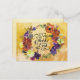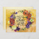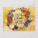 Thanksgiving inspirational postcard depicts beautiful rustic autumn watercolor floral purple, burnt orange, blue and yellow flowers and greenery. If features a portion of Bible Verse Psalm 136:1, "Give thanks to the LORD, for he is good. His love endures forever._