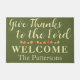 Welcome the fall season and impress your guests with this personalised autumn-themed door mat featuring the uplifting biblical scripture from Psalm 136:3: "Give thanks to the Lord." This beautifully crafted Thanksgiving door mat showcases elegant cream script calligraphy for the verse, paired with charming fall elements like acorns, vibrant red, yellow, and orange maple leaves, and pumpkins. The bottom features the word "Welcome" and your custom family name in sleek cream block font, all set against a rich moss green or kombu green background. Perfect for adding warmth and style to your autumn outdoor décor or as a thoughtful Thanksgiving decoration. Ideal for entryways, porches, or front doors, this customisable door mat brings both beauty and a welcoming touch to your home this fall season.