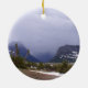 The clouds of an approaching mountain thunderstorm hang low over the rocky peaks. In the foreground, the small evergreen trees of an alpine forest stand among the snow that lingers in summer. This wild scenery from the Montana Rockies shows the massive majesty of the mountains, the dark clouds of the storm, and the tenacity of the trees that grow in the harsh climate. Add the right year to this Rocky Mountain landscape ornament, and let it bring back memories of your own travel there, or inspire your dreams. The text "Glacier National Park" is also customisable. This scenic photo also looks great on square-shaped ornaments. Enjoy the view!