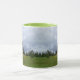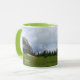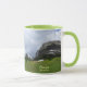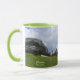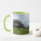 The massive form of a mountain rises above an alpine meadow in Glacier National Park. Patches of snow linger in summer. Clouds billow in the sky overhead. The meadow is full of small yellow flowers known as glacier lilies. These beautiful wildflowers are an important food source for mountain wildlife. Bring this beautiful scene from the Montana Rockies to your home, and enjoy it with your favourite hot drink. This scenic mug has a reversed version of the same landscape photo on the other side. The photos are joined to create a wrap-around picture. On each side, the text "Glacier National Park" appears in a yellow hue that resembles the colour of the glacier lilies.