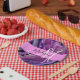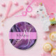 Glam abstract purple, lilac and violet shimmer liquid texture monogram name and initial paper plate. Your custom name and monogram are written in an elegant hand lettered script with a pink background.