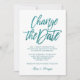 Glamourous and elegant Wedding Postponement or Date Change announcement featuring a trendy glitter calligraphy script lettering saying "Change the date“ in luxury glitter tourquoise blue over a white background to let your guest know the postponement or cancellation of your wedding and new plans,